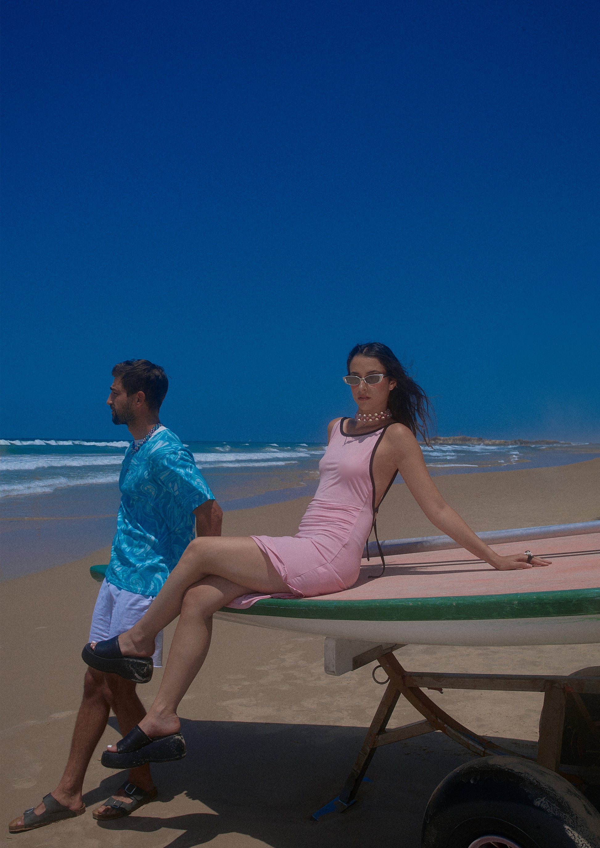 Candy 'Carrie' dress in baby pink and black straps detail is crafted from super soft fine knitted fibres. Cut to a fitted silhouette with an open back, gathering on the waist area for a flattering look with asymmetric hemline.