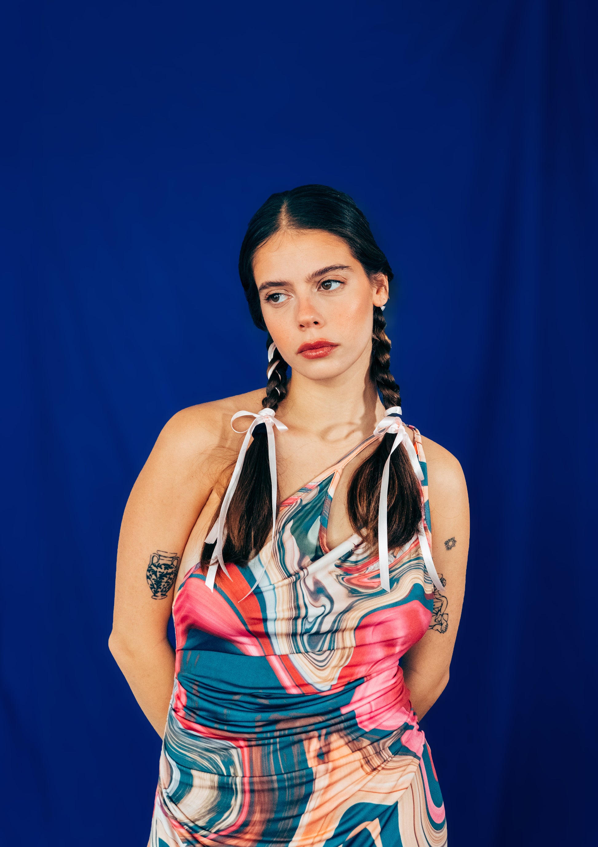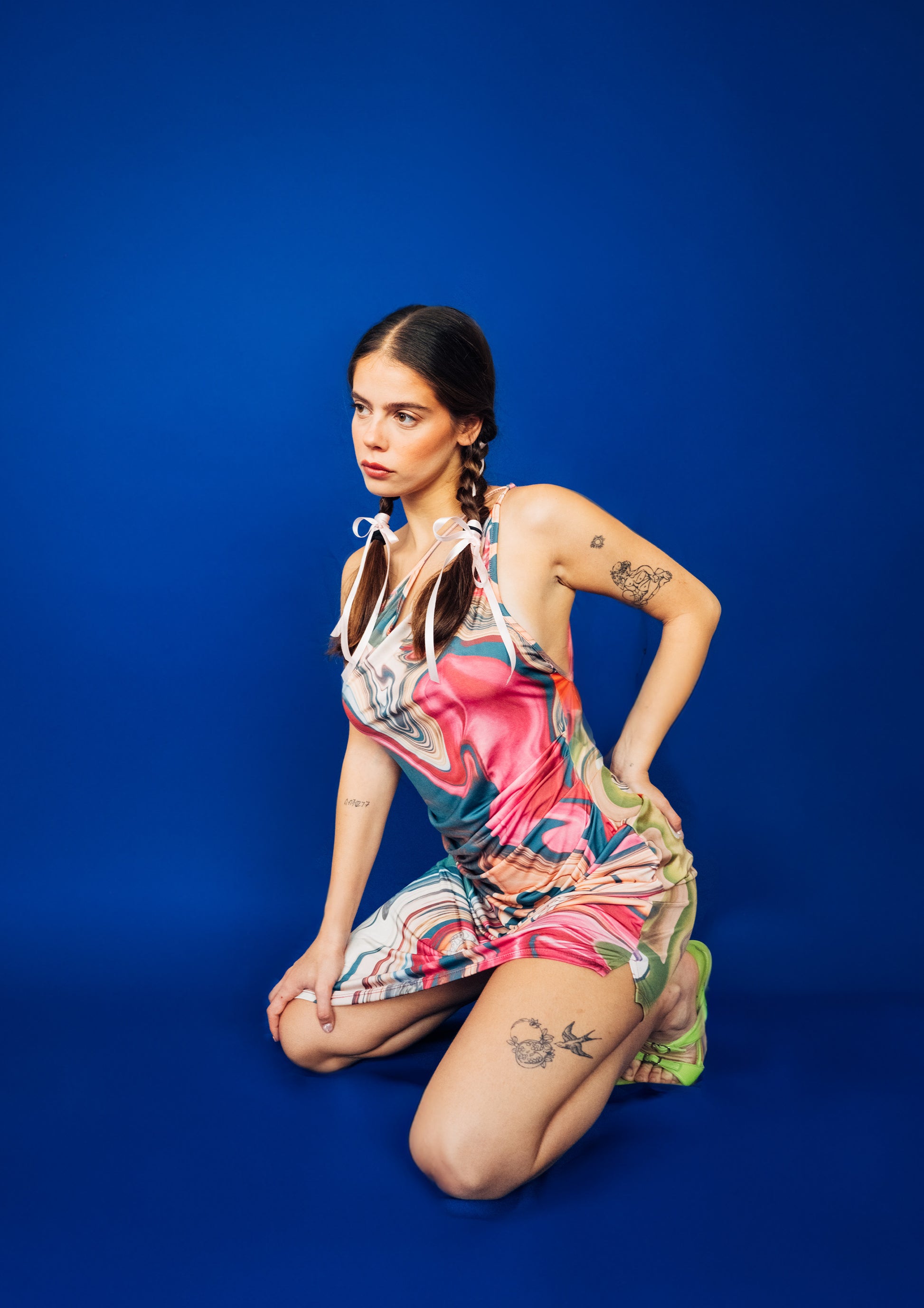 'Carrie' dress features an original Capri print and is crafted from super soft fine knitted fibres. Cut to a fitted silhouette with an open back, gathering on the waist area for a flattering look with asymmetric hemline.