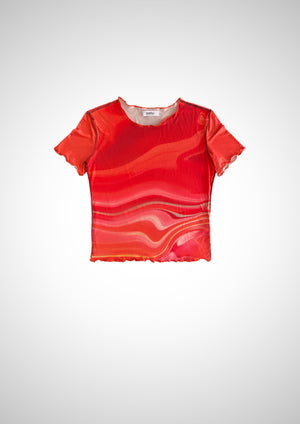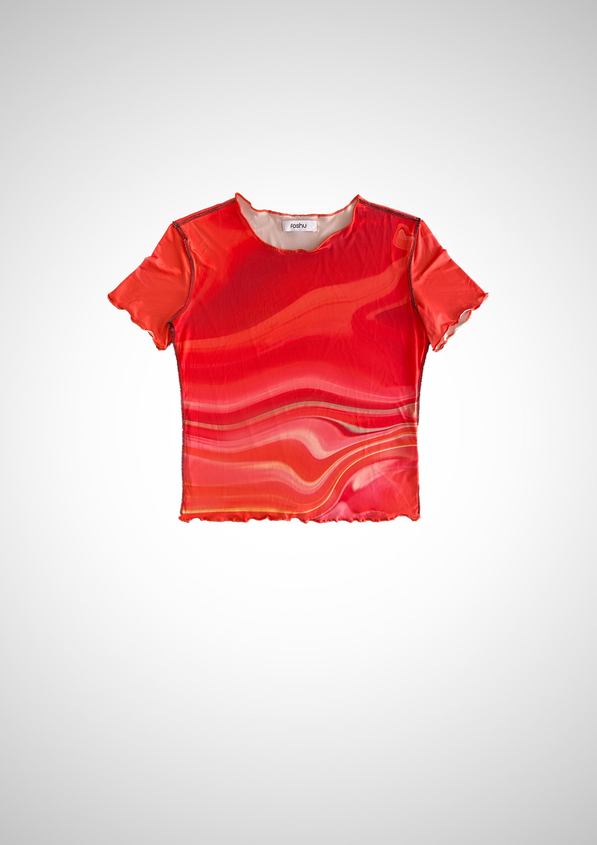Short sleeve T-shirt features an original Fuoco print and is crafted from fine knitted fibres with a semi-sheer finish. Cut to a fitted silhouette with a second skin appearance, detailed with reverse overlock stitching.