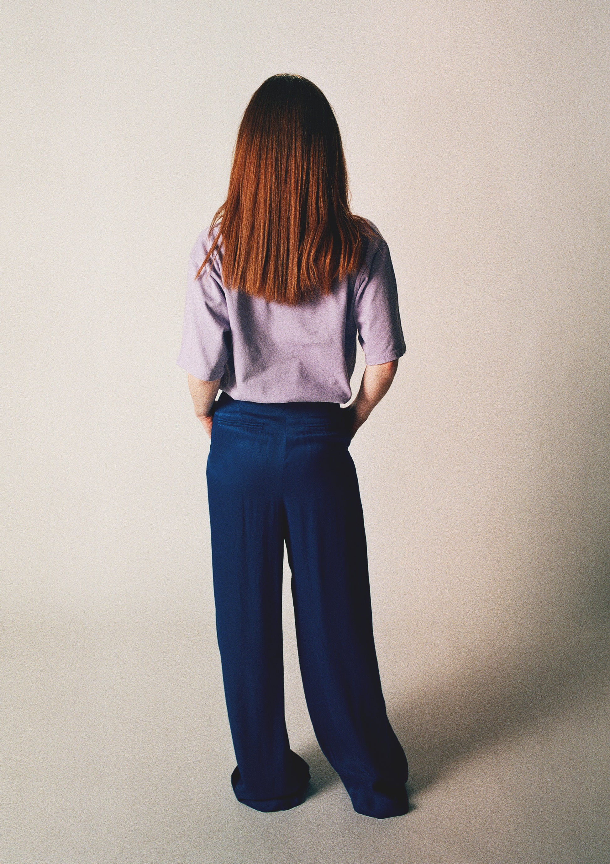 Royal blue tailored trousers are crafted from a soft satin viscose and detailed with front pleats. Complete with side pockets and back well pockets. Cut to a regular fit with a high waist, wide leg long length.