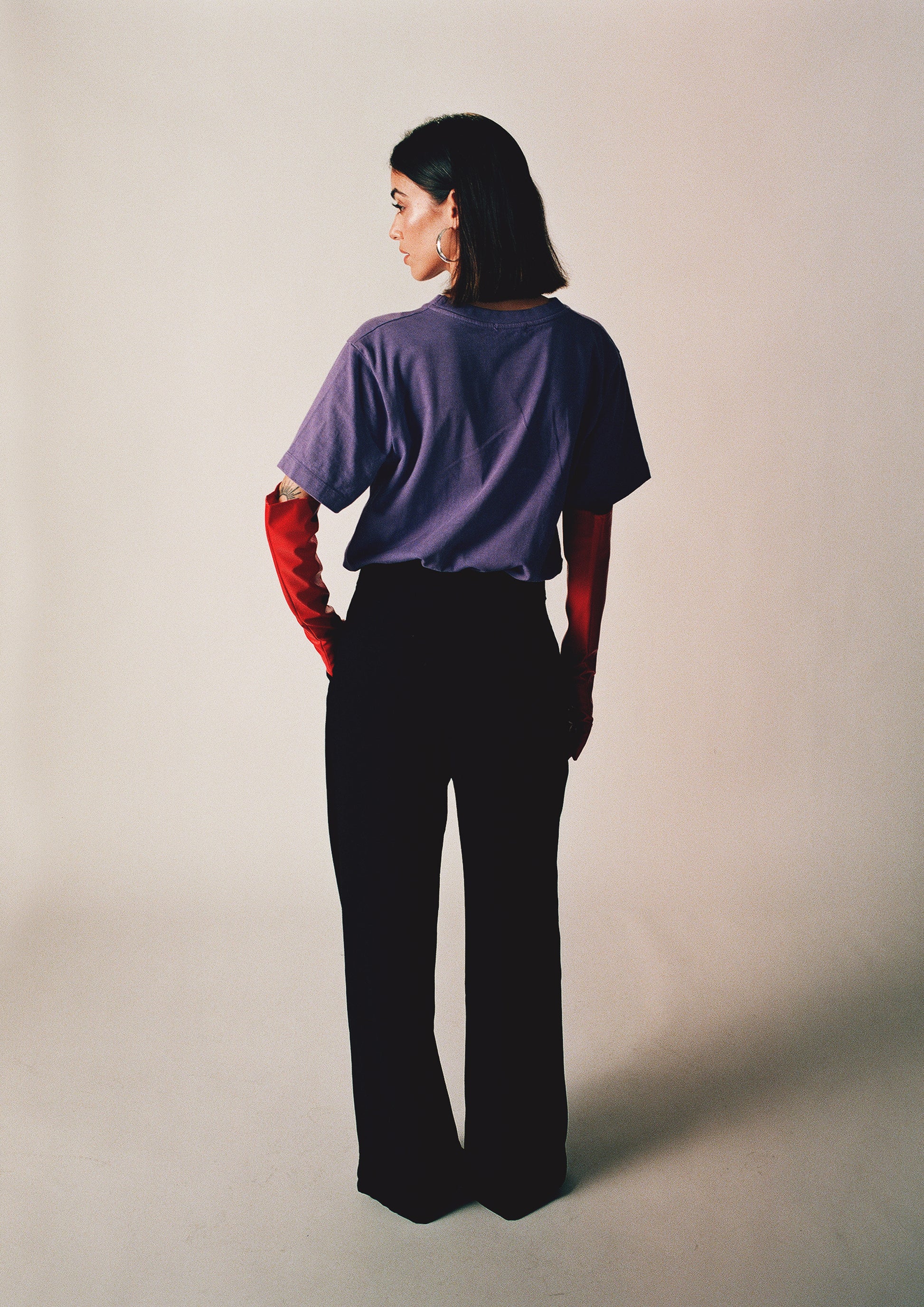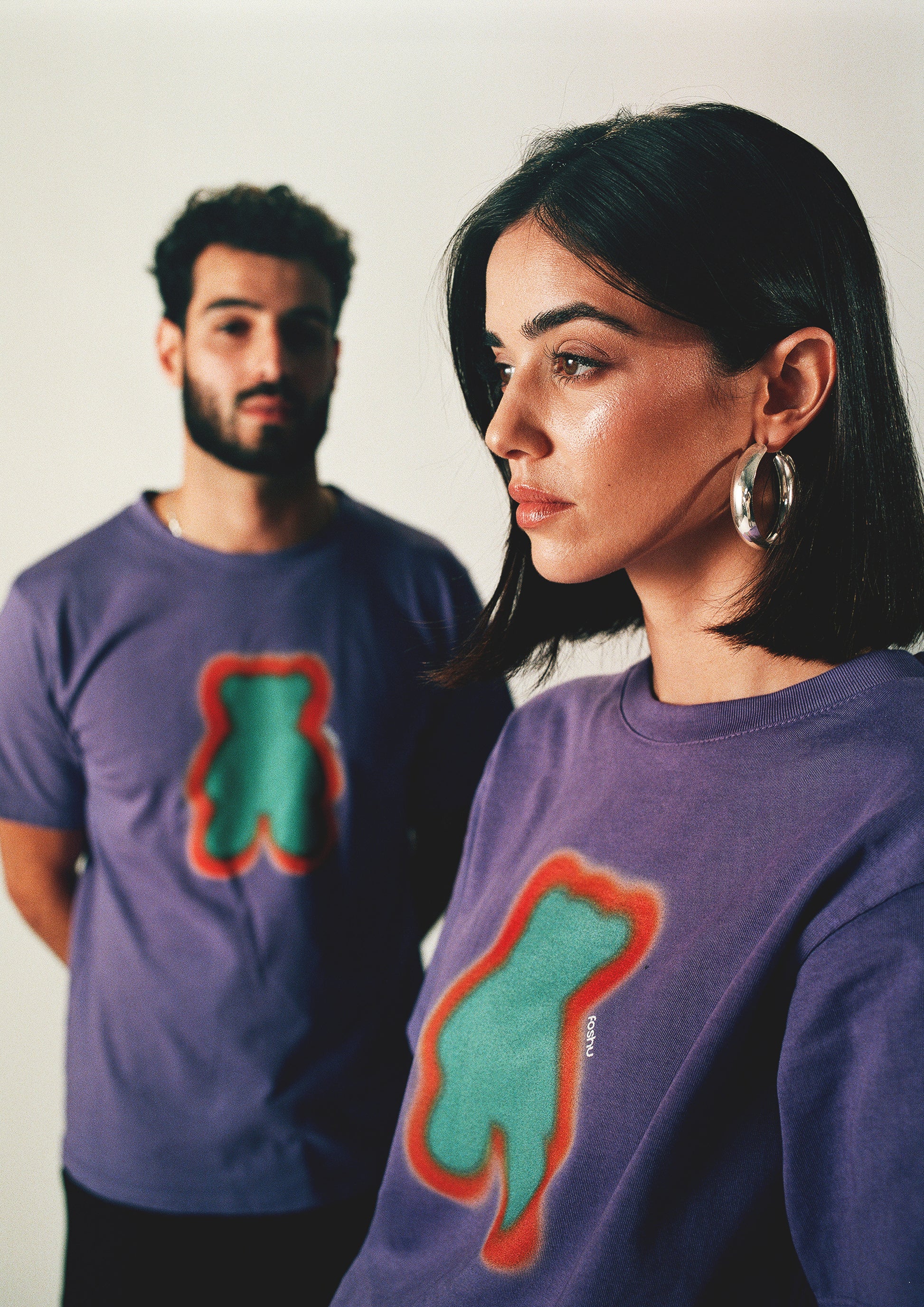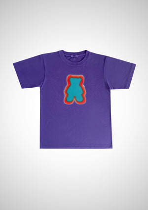 Purple crew neck t-shirt features a teddy original print at the center front and is cut to oversized fit.