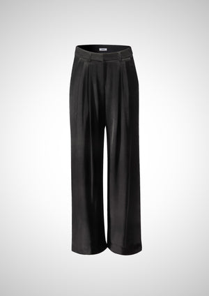 Black trousers are crafted from a soft satin viscose and detailed with front pleats. Complete with side pockets and back well pockets. Cut to a regular fit with a high waist, wide leg long length.
