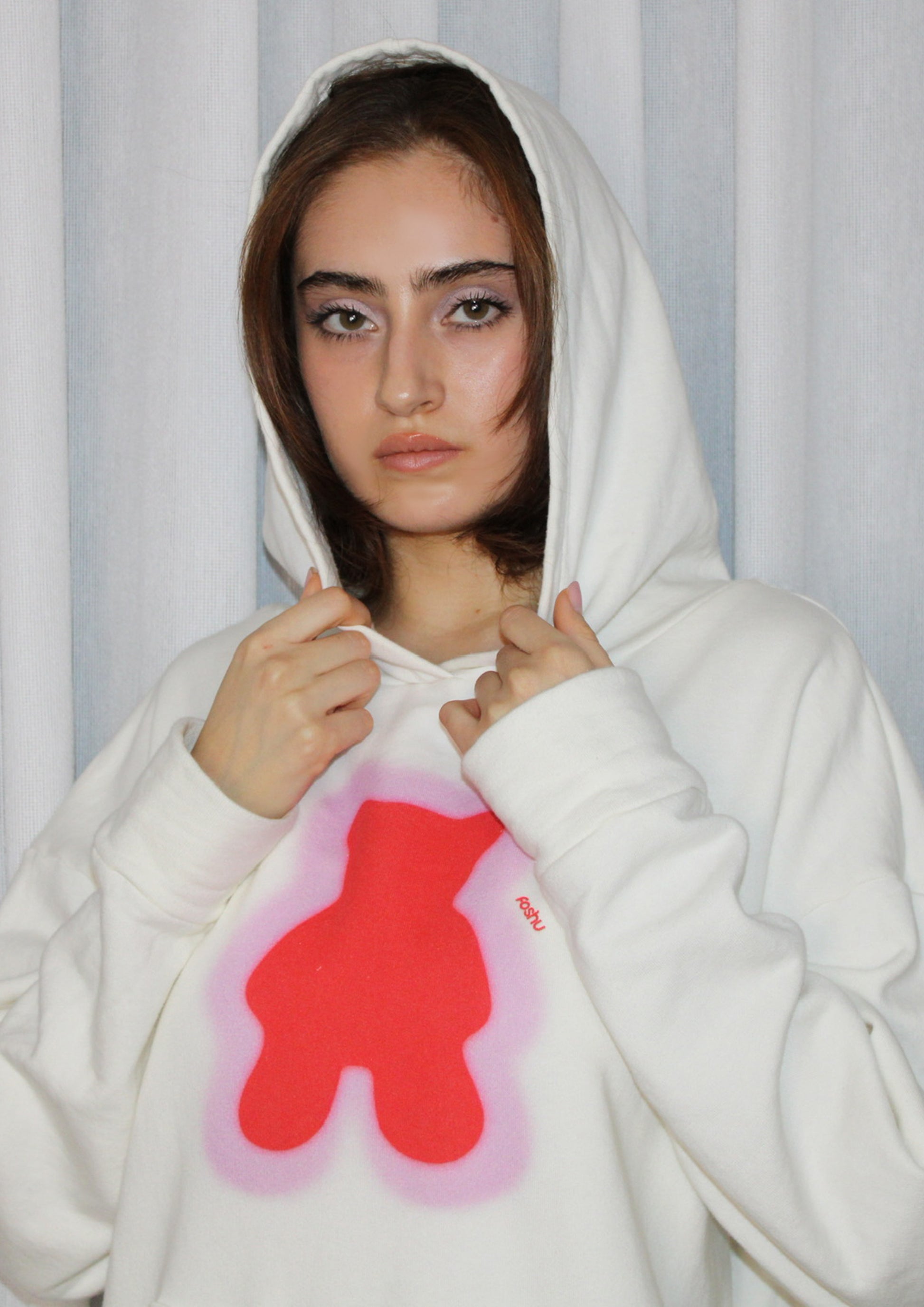 Cream Hoodie features a teddy original print at the center front and is cut to oversized fit.