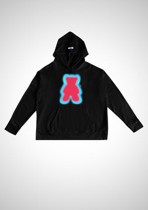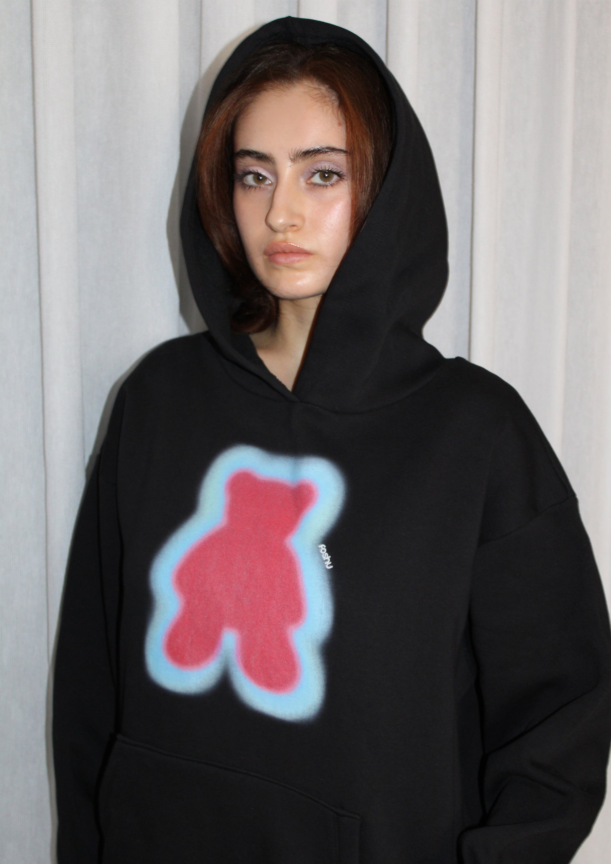 Black Hoodie features a teddy original print at the center front and is cut to oversized fit.